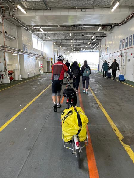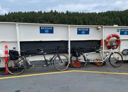 Once you've been given the go-ahead to board, you show your ticket and walk your bike on board, choosing a spot to lean it up against something. For tandems (especially with trailers), good leaning spots might be limited. The ferry employees are very helpful and good humored about this process.