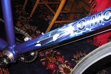 This bike (Robbie) began what may very well turn out to be a bit of a tradition - he was a surprise gift from me to the two of us for our 35th anniversary. Dwan at Co-Motion helped me to find a custom painter (a motorcycle painter) who could put on a paint job to my specifications, that would depict scenes of significance to the two of us from our first 35 years together, 25 of which had been spent tandeming. The four scenes we settled on were: the Heceta Head lighthouse in Oregon, Mt. Rainier, a bald eagle, and an orca. All of these were iconic reminders of our time together and the many activities we had shared over the years. The end result was beautiful - thank you Dwan! Robbie is a lightweight performance bike. He hails from the era before Co-Motion eliminated the internal lateral tubes from the Robusta line. He is a joy to ride - like driving a sports car. He doesn't travel much - he went to California for the Tour de Palm Springs a few years ago, riding in the back of our van. He was our first performance bike and our first anniversary bike, so will always be special to us for those reasons.