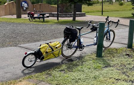 About the time we were ready to take our first step into serious tandem travel and touring, a couple of guys in Eugene, Oregon had come up with the Bike Friday concept, a small-wheeled, folding machine that could travel in a standard suitcase and that, as an added bonus, could carry itself, so to speak, and all associated tools and packing materials, in a trailer that was made from the cases and a small frame and pair of wheels. This was before S&S couplers had really taken off, so there was not yet a widely available take apart or folding option for mainstream, full sized tandems. If you wanted to travel, to carry the bike in airline checkable luggage, and to be fully self-contained, the Bike Friday tandem was it at the time (and truly still is, really). In fact, the Bike Friday might be the best overall design for those who want travel to be their main focus. When it comes to group rides, the Friday has a minor disadvantage from the small wheels, in our experience. It was this minor disadvantage, experienced when riding in groups, that led us to purchase a second travel bike, with full-sized wheels. So, we ended up with bikes from both the small wheel and full-sized wheel world. We loved the Two'sDay and took it on several trips, mostly self-supported and self-contained. However, since we hadn't used it much in the last few years, we sold it in Spring, 2019.